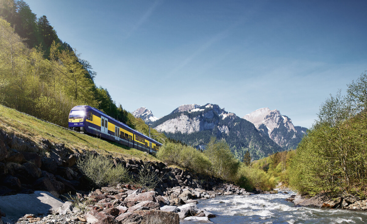 Die Berner Oberland-Bahn erschliesst die Lütschinentäler und verbindet mit ihren blau-gelben Kompositionen Interlaken Ost mit Grindelwald und Lauterbrunnen.